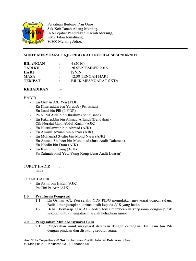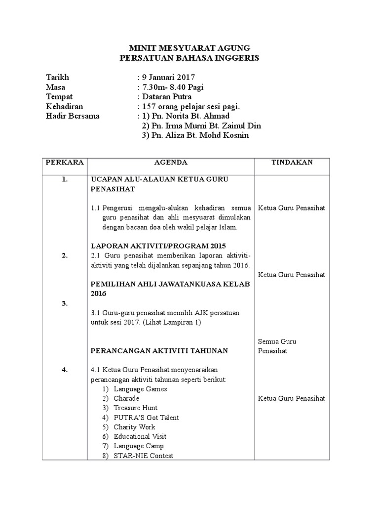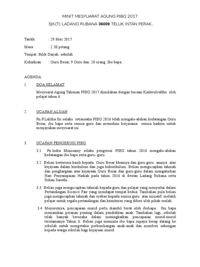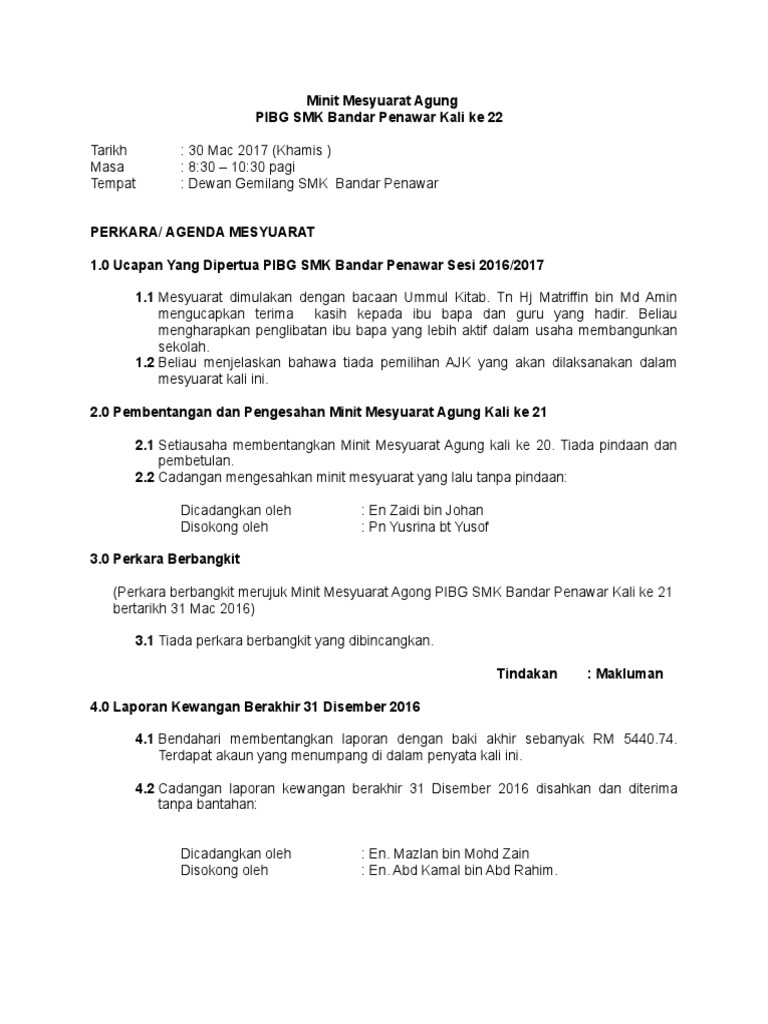 Contoh Minit Mesyuarat Agung Pibg 2017 Kali Ke 22 Pdf